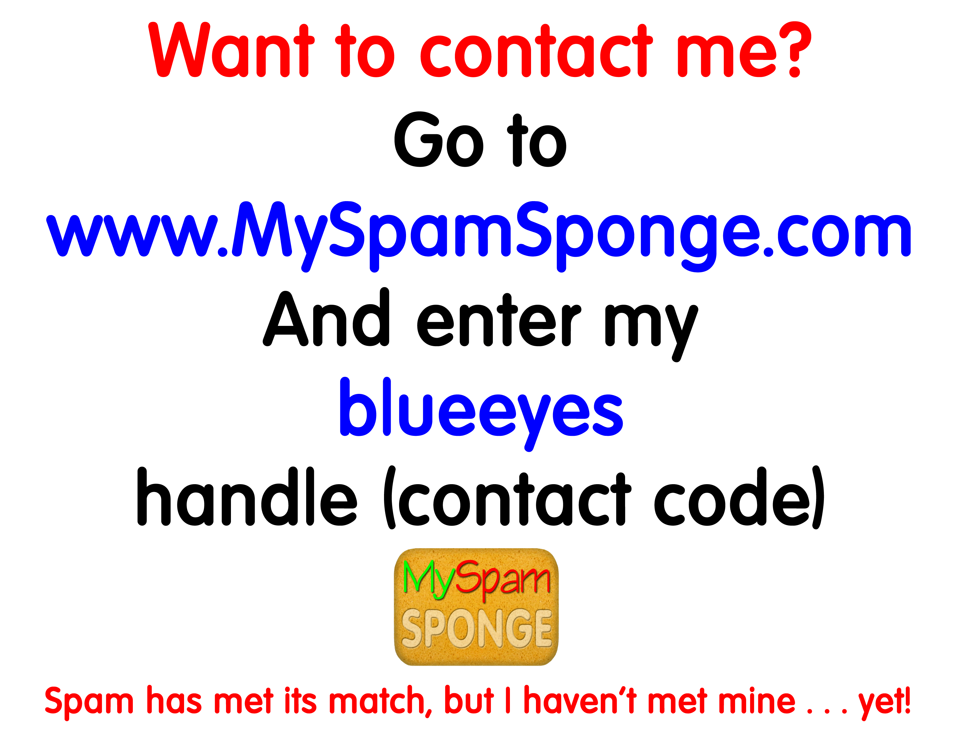 The text says: Want to contact me? The font that we used for the above T-shirt was Elementary Heavy SF, but you can choose another one. Obviously, you must substitute your handle in place of the blueeyes one shown in the example. You can make your own clothing by using inexpensive ink jet T-shirt iron-on transfer paper, such as that sold by Avery® (item # 3275)*. Or have a T-shirt, jacket, hat, book bag (or whatever) made for you by any of the countless local and Internet-based companies that specialize in such work. * If you make your own, don't leave the iron on longer than directed. We left it on for a total of 5 minutes (2 minutes longer than directed), and it just scorched the transfer film in most areas, producing a yellowish discoloration. To get you started, you can download templates that include this text and the MySpamSponge logo. We have templates in 4 formats: GIF image: www.myspamsponge.com/templates/template1_gif1.gif If you click the GIF link, the GIF image itself will appear. To save it, right-click the image and select Save Image As. Adobe Reader (Acrobat .pdf file); file size is smaller than any of the others: www.myspamsponge.com/templates/template1_acrobat.pdf